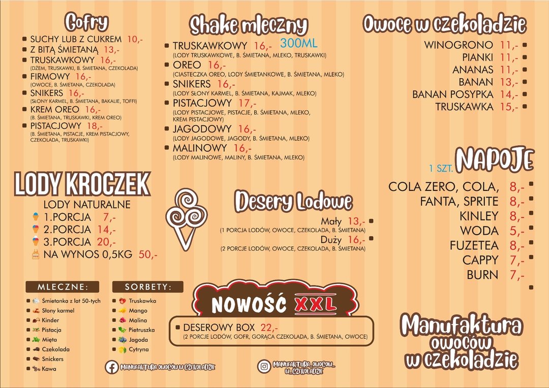-Owoce w belgijskiej czekoladzie -Gofry biszkoptowe podawane z Naszymi truskawkami -100% lody naturalne z Olsztyńskiej Starówki ,,Kroczek'' -viral dubajski -kawunia w paru odsłonach